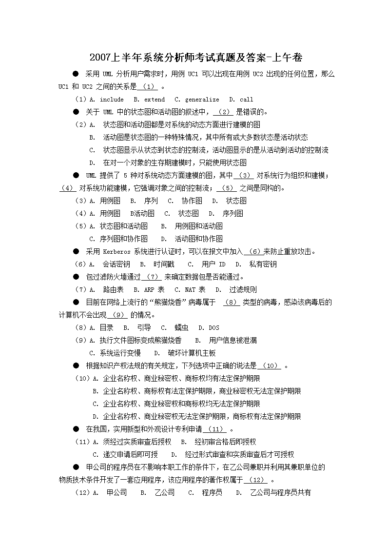 【文档名称】2007下半年系统分析师考试真题及答案-上午卷(Word版)【文档格式】Word版【文档下载】VIP会员文档下载【文档介绍】{{site_n...