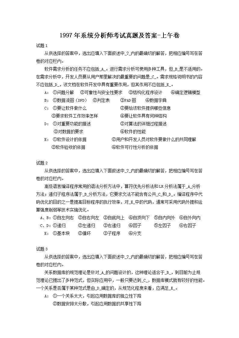 【文档名称】1997年系统分析师考试真题及答案-上午卷(Word版)【文档格式】Word版【文档下载】VIP会员文档下载【文档介绍】{{site_nam...