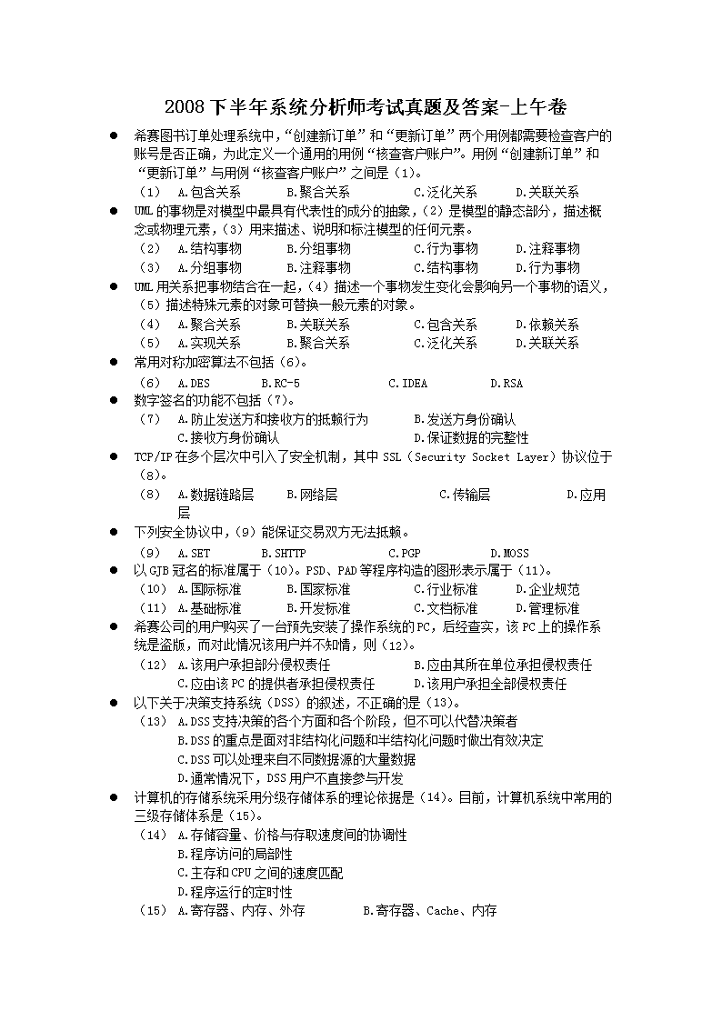 【文档名称】2008下半年系统分析师考试真题及答案-上午卷(Word版)【文档格式】Word版【文档下载】VIP会员文档下载【文档介绍】{{site_n...