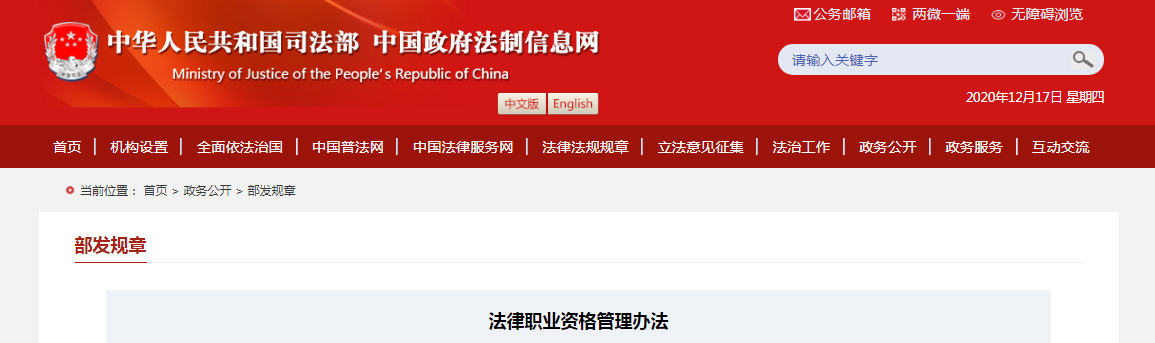 《法律职业资格管理办法》已经2020年11月17日司法部部务会议审议通过,现予公布,自2021年1月1日起施行。法律职业资格管理办法(2020年12月1日司法部令第1...