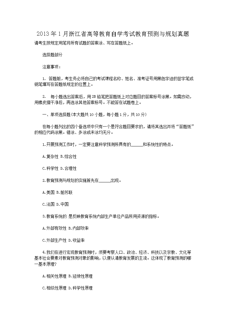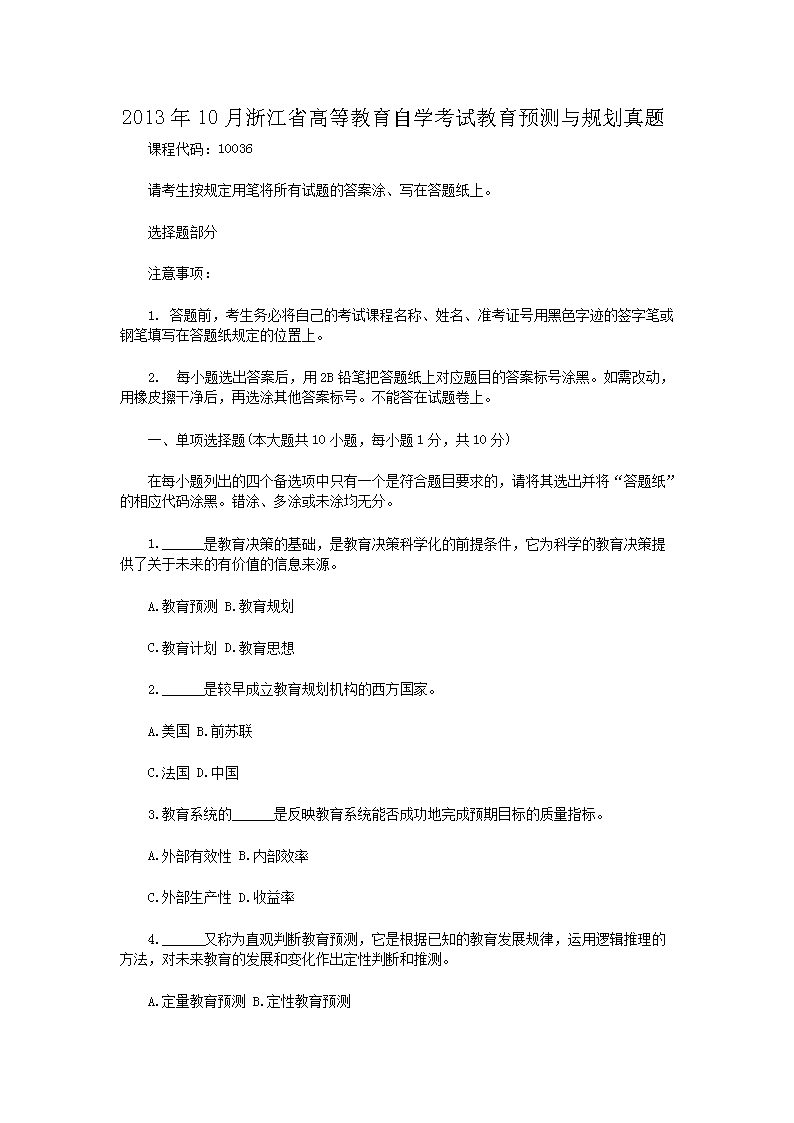 【文档名称】2013年10月浙江省高等教育自学考试教育预测与规划真题(Word版)【文档格式】Word版【文档下载】VIP会员文档下载【文档介绍】{{s...
