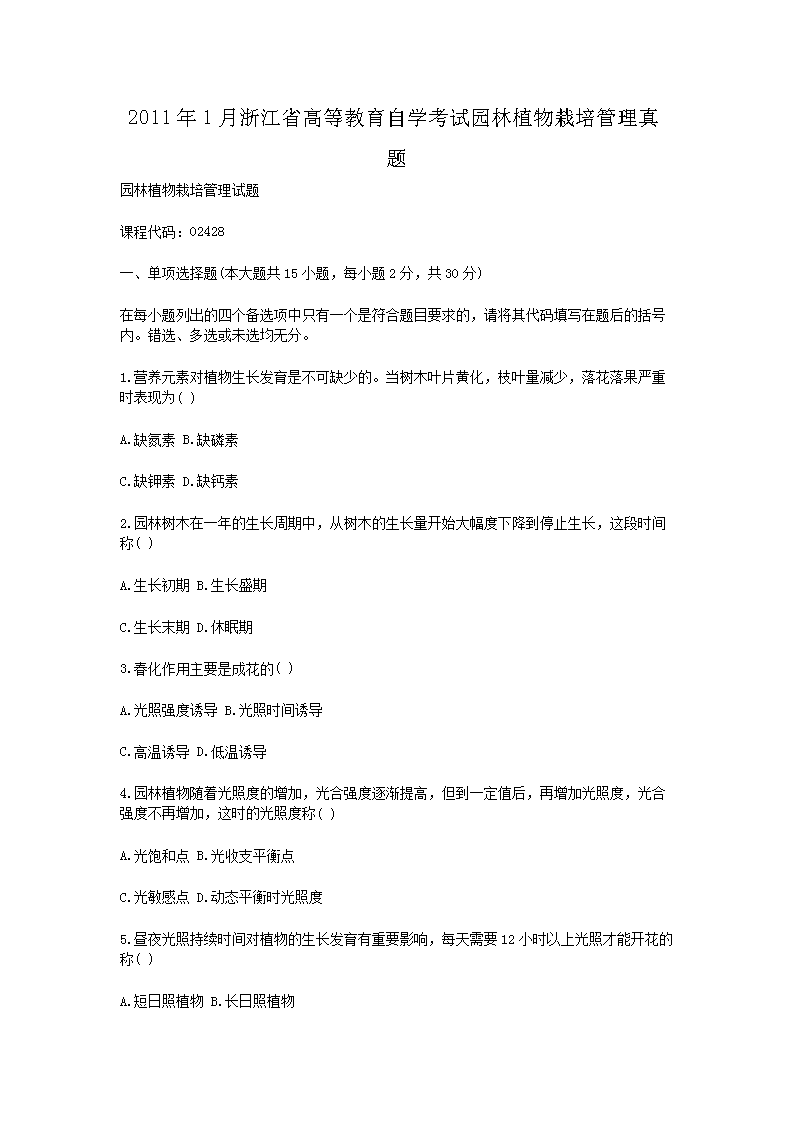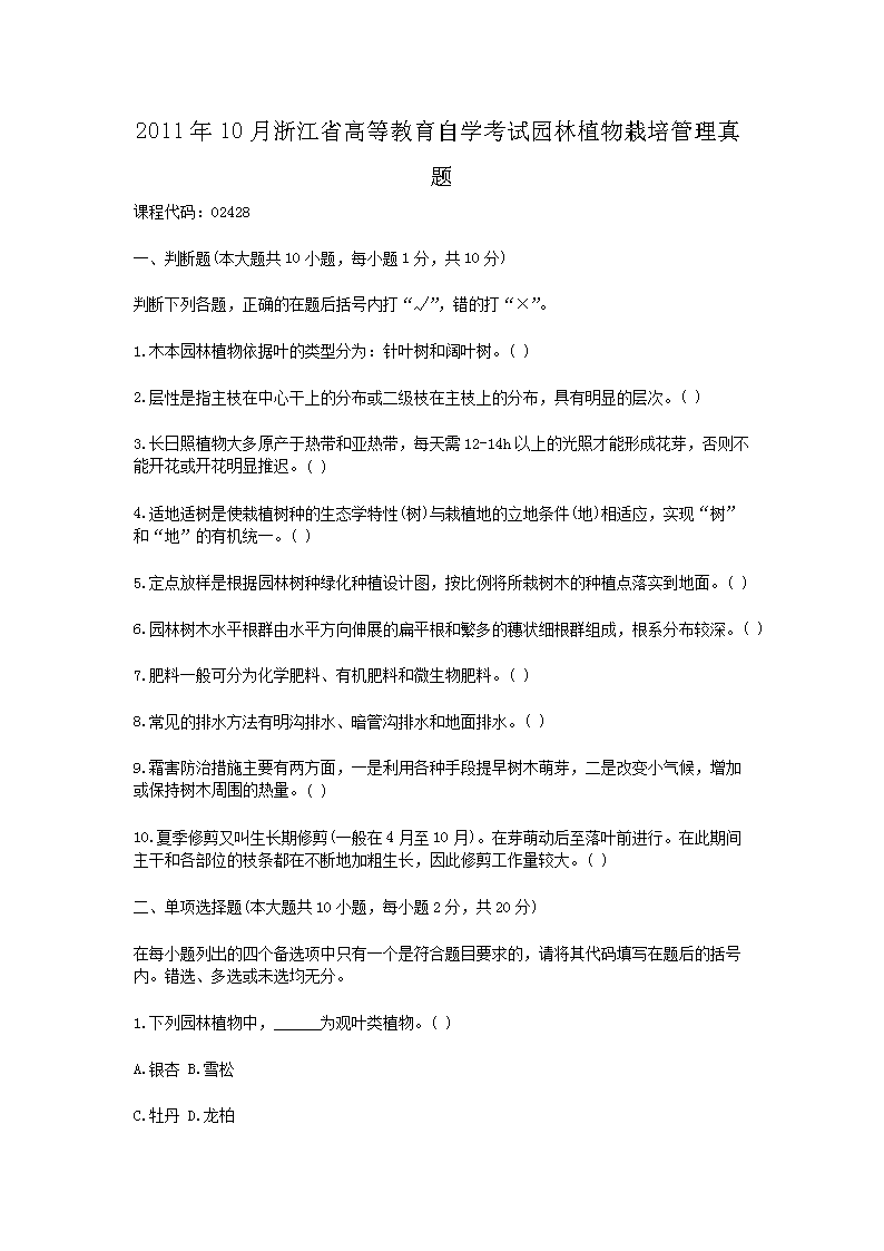 【文档名称】2011年10月浙江省高等教育自学考试园林植物栽培管理真题(Word版)【文档格式】Word版【文档下载】VIP会员文档下载【文档介绍】{{...