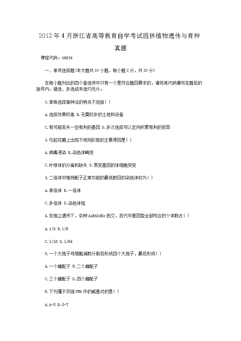 【文档名称】2012年4月浙江省高等教育自学考试园林植物遗传与育种真题(Word版)【文档格式】Word版【文档下载】VIP会员文档下载【文档介绍】{{...