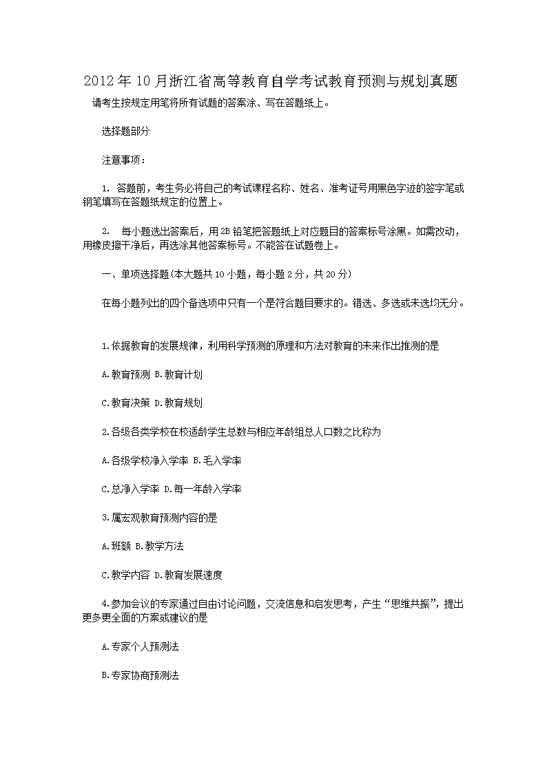 【文档名称】2012年10月浙江省高等教育自学考试教育预测与规划真题(Word版)【文档格式】Word版【文档下载】VIP会员文档下载【文档介绍】{{s...