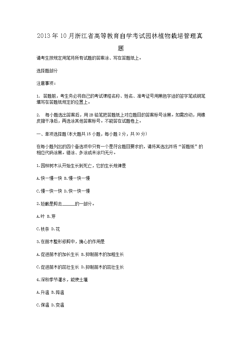 【文档名称】2013年10月浙江省高等教育自学考试园林植物栽培管理真题(Word版)【文档格式】Word版【文档下载】VIP会员文档下载【文档介绍】{{...