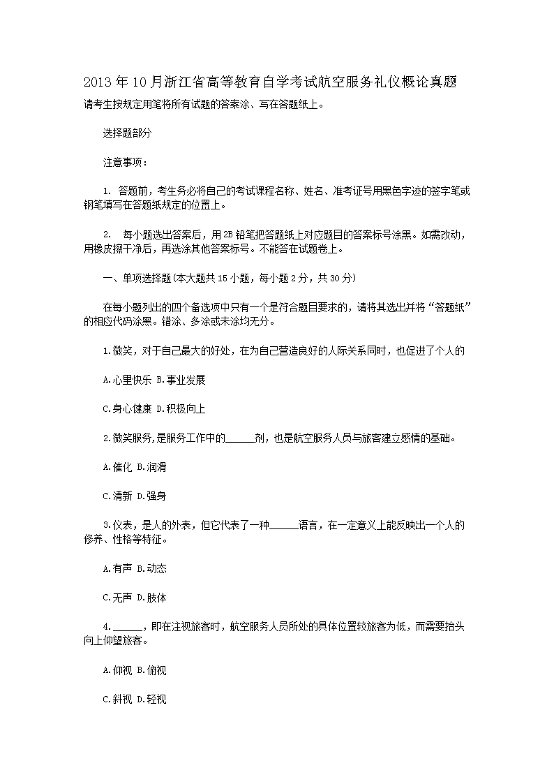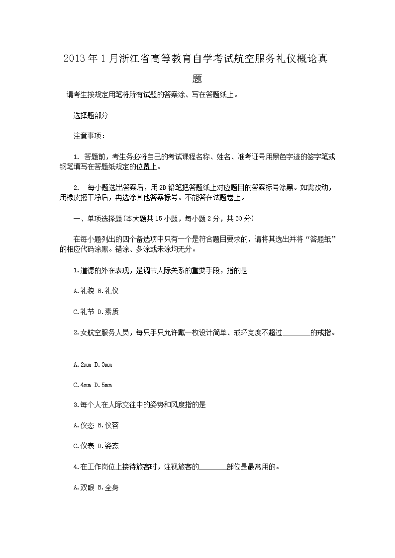 【文档名称】2013年10月浙江省高等教育自学考试航空服务礼仪概论真题(Word版)【文档格式】Word版【文档下载】VIP会员文档下载【文档介绍】{{...