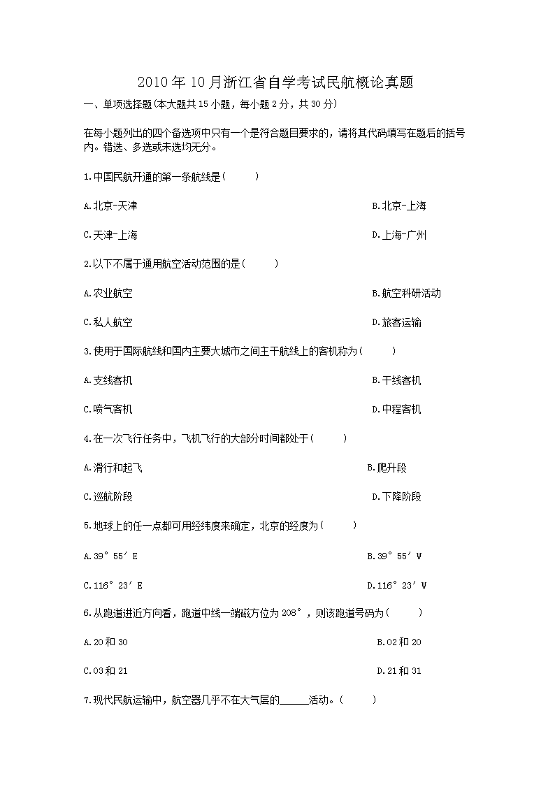 【文档名称】2010年10月浙江省自学考试民航概论真题(Word版)【文档格式】Word版【文档下载】VIP会员文档下载【文档介绍】{{site_nam...