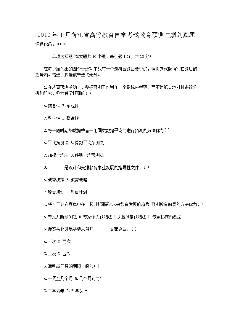 【文档名称】2010年1月浙江省高等教育自学考试教育预测与规划真题(Word版)【文档格式】Word版【文档下载】VIP会员文档下载【文档介绍】{{si...