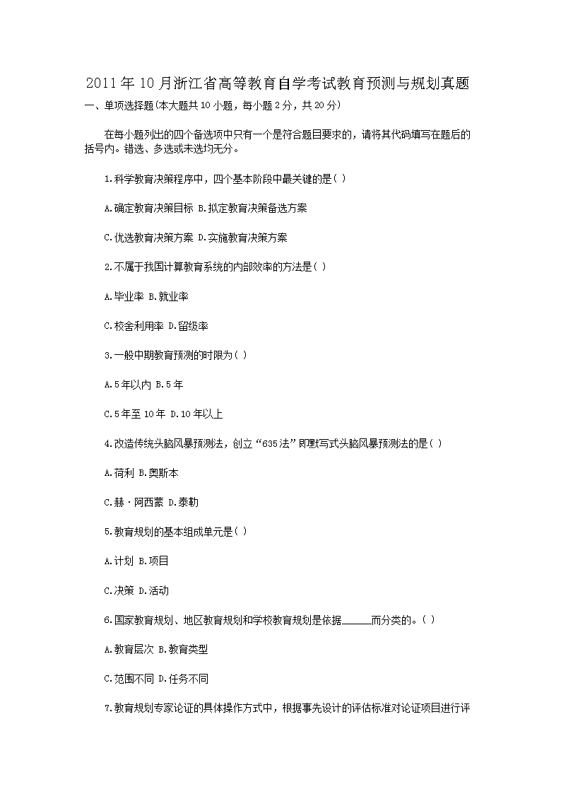 【文档名称】2011年10月浙江省高等教育自学考试教育预测与规划真题(Word版)【文档格式】Word版【文档下载】VIP会员文档下载【文档介绍】{{s...