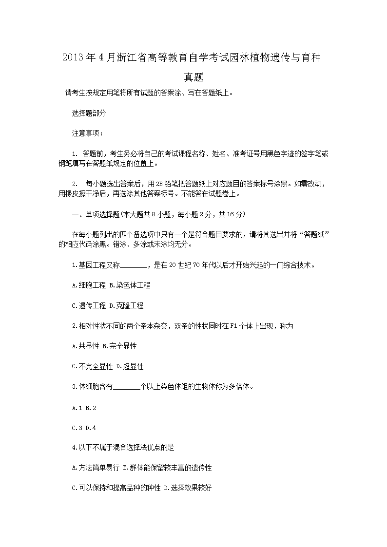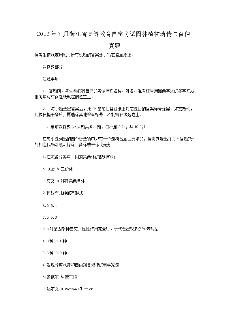 【文档名称】2013年7月浙江省高等教育自学考试园林植物遗传与育种真题(Word版)【文档格式】Word版【文档下载】VIP会员文档下载【文档介绍】{{...