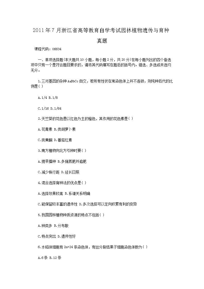 【文档名称】2011年7月浙江省高等教育自学考试园林植物遗传与育种真题(Word版)【文档格式】Word版【文档下载】VIP会员文档下载【文档介绍】{{...