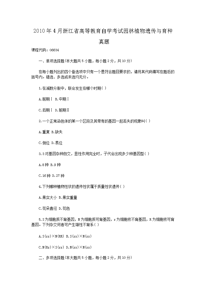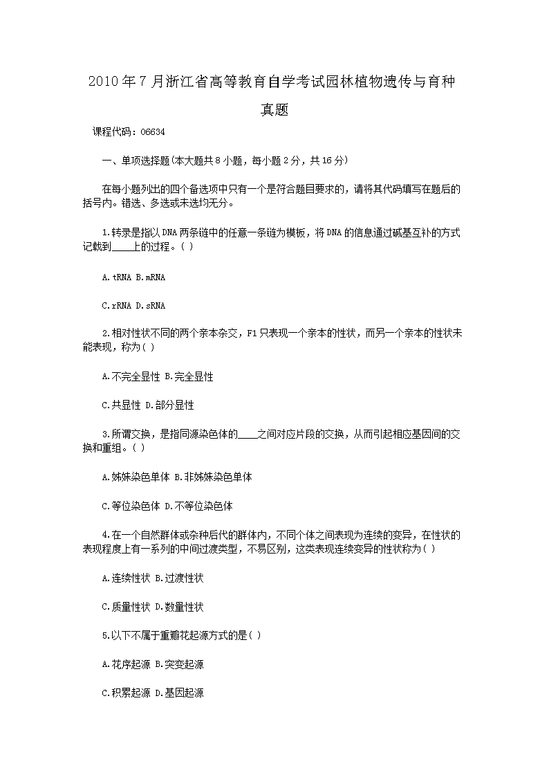 【文档名称】2010年7月浙江省高等教育自学考试园林植物遗传与育种真题(Word版)【文档格式】Word版【文档下载】VIP会员文档下载【文档介绍】{{...