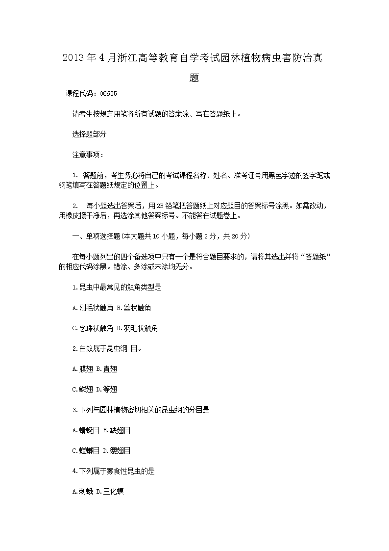 【文档名称】2013年4月浙江高等教育自学考试园林植物病虫害防治真题(Word版)【文档格式】Word版【文档下载】VIP会员文档下载【文档介绍】{{s...