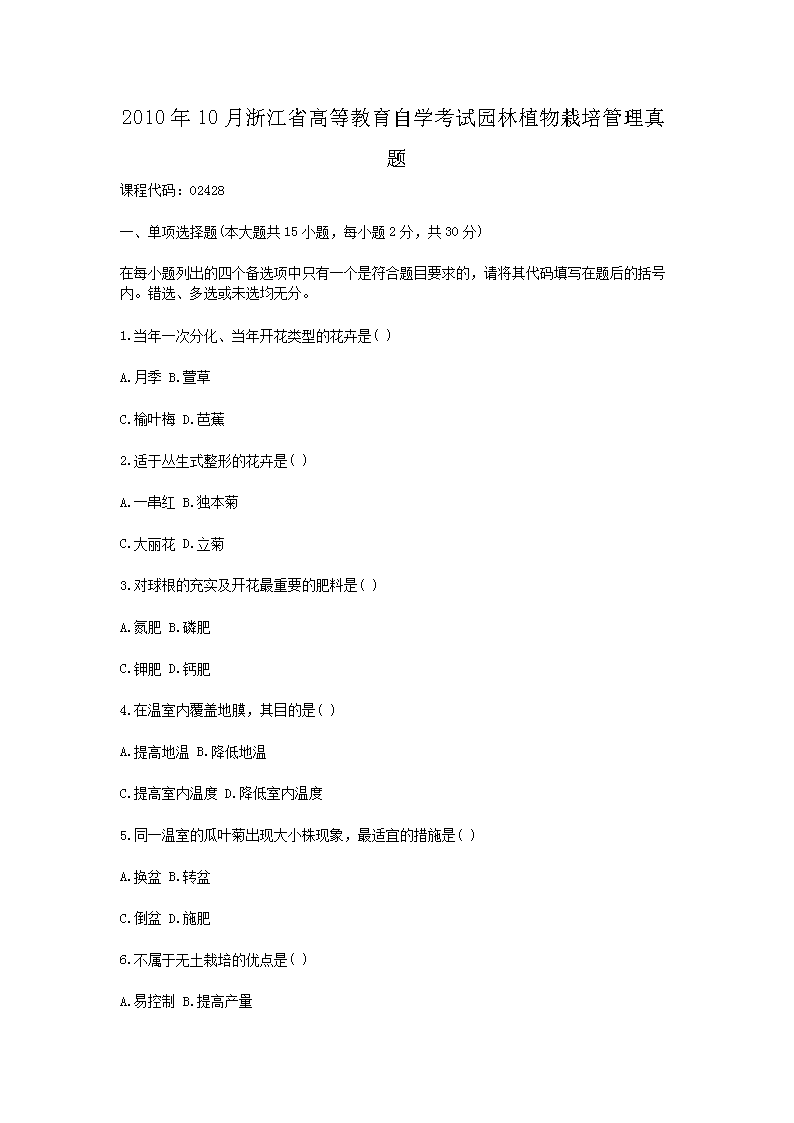 【文档名称】2010年10月浙江省高等教育自学考试园林植物栽培管理真题(Word版)【文档格式】Word版【文档下载】VIP会员文档下载【文档介绍】{{...