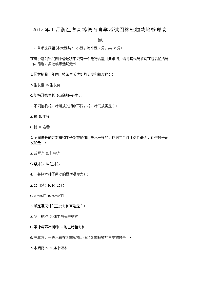【文档名称】2012年1月浙江省高等教育自学考试园林植物栽培管理真题(Word版)【文档格式】Word版【文档下载】VIP会员文档下载【文档介绍】{{s...