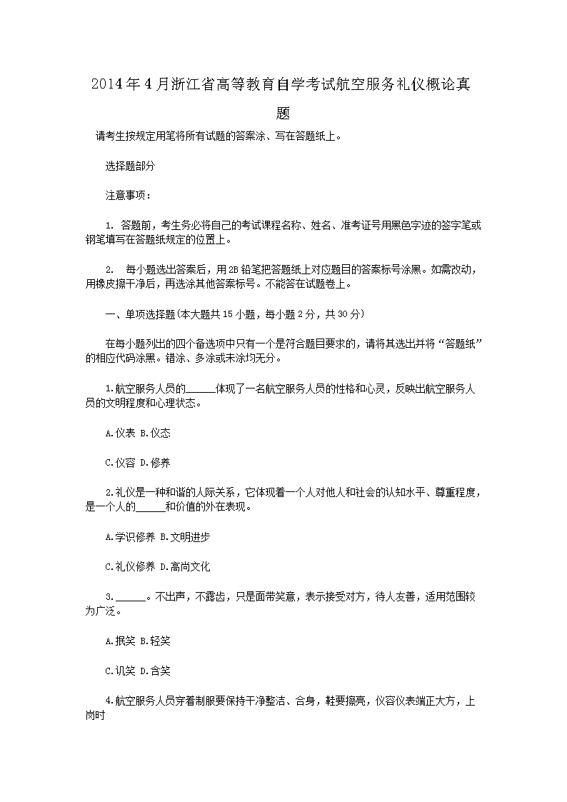 【文档名称】2014年4月浙江省高等教育自学考试航空服务礼仪概论真题(Word版)【文档格式】Word版【文档下载】VIP会员文档下载【文档介绍】{{s...