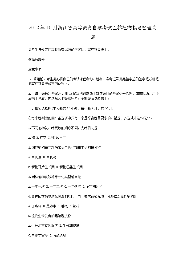 【文档名称】2012年10月浙江省高等教育自学考试园林植物栽培管理真题(Word版)【文档格式】Word版【文档下载】VIP会员文档下载【文档介绍】{{...