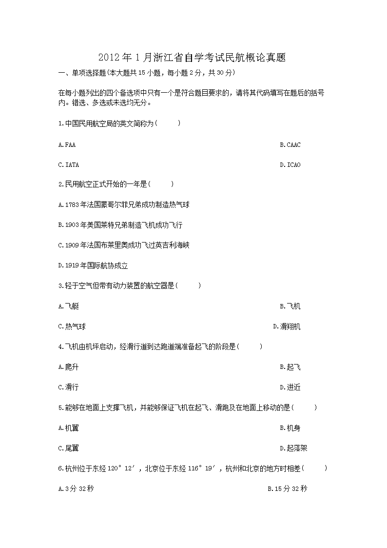【文档名称】2012年1月浙江省自学考试民航概论真题(Word版)【文档格式】Word版【文档下载】VIP会员文档下载【文档介绍】{{site_name...