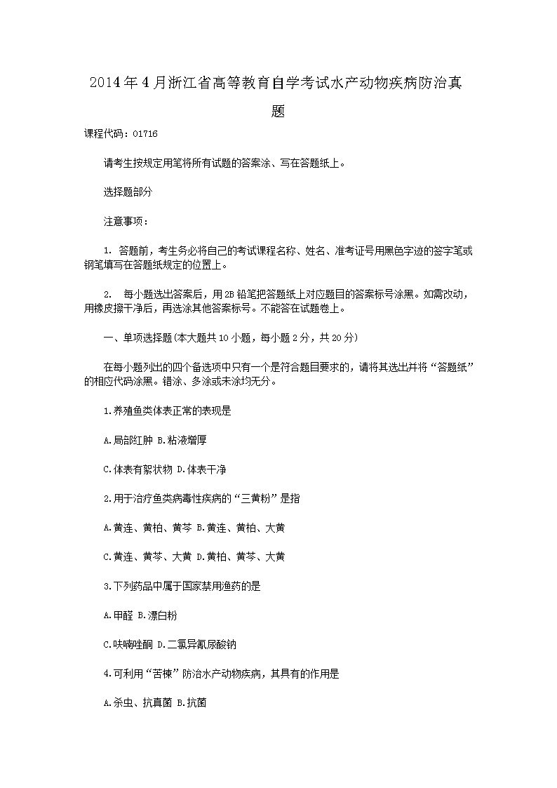 【文档名称】2014年4月浙江省高等教育自学考试水产动物疾病防治真题(Word版)【文档格式】Word版【文档下载】VIP会员文档下载【文档介绍】{{s...