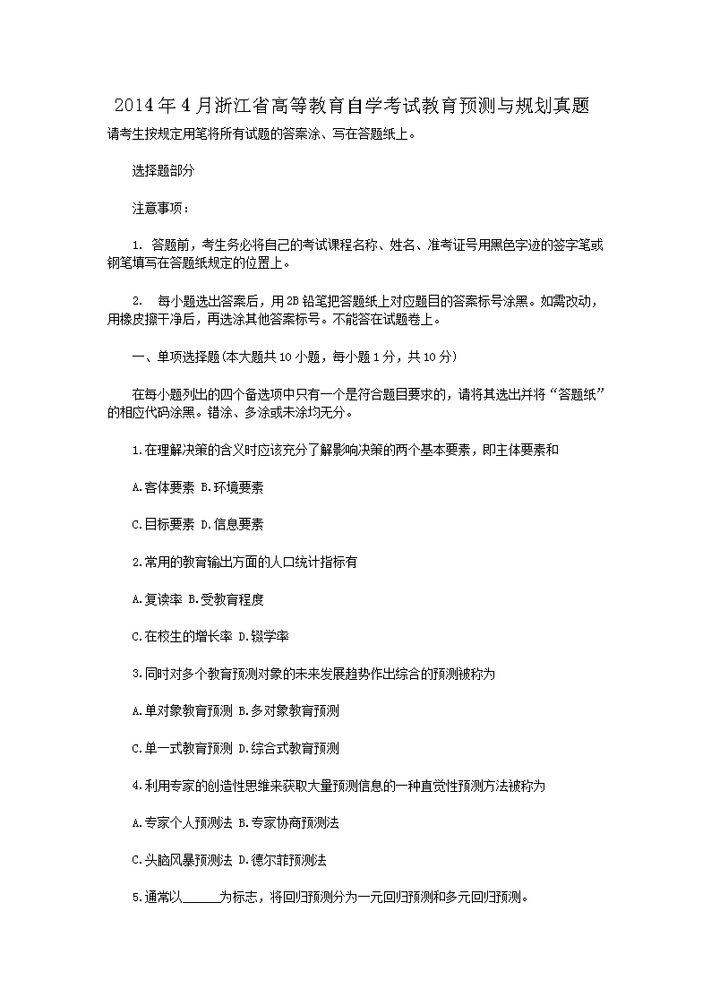 【文档名称】2014年4月浙江省高等教育自学考试教育预测与规划真题(Word版)【文档格式】Word版【文档下载】VIP会员文档下载【文档介绍】{{si...