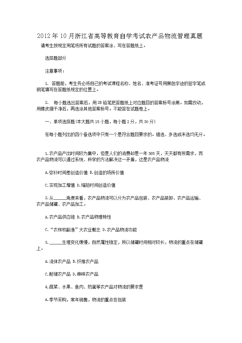 【文档名称】2012年10月浙江省高等教育自学考试农产品物流管理真题(Word版)【文档格式】Word版【文档下载】VIP会员文档下载【文档介绍】{{s...