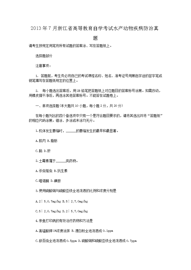 【文档名称】2013年7月浙江省高等教育自学考试水产动物疾病防治真题(Word版)【文档格式】Word版【文档下载】VIP会员文档下载【文档介绍】{{s...