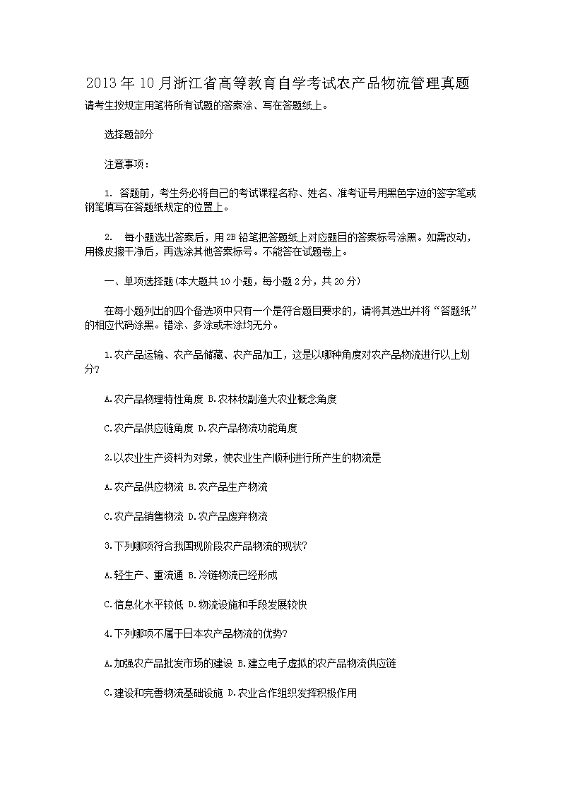【文档名称】2013年10月浙江省高等教育自学考试农产品物流管理真题(Word版)【文档格式】Word版【文档下载】VIP会员文档下载【文档介绍】{{s...