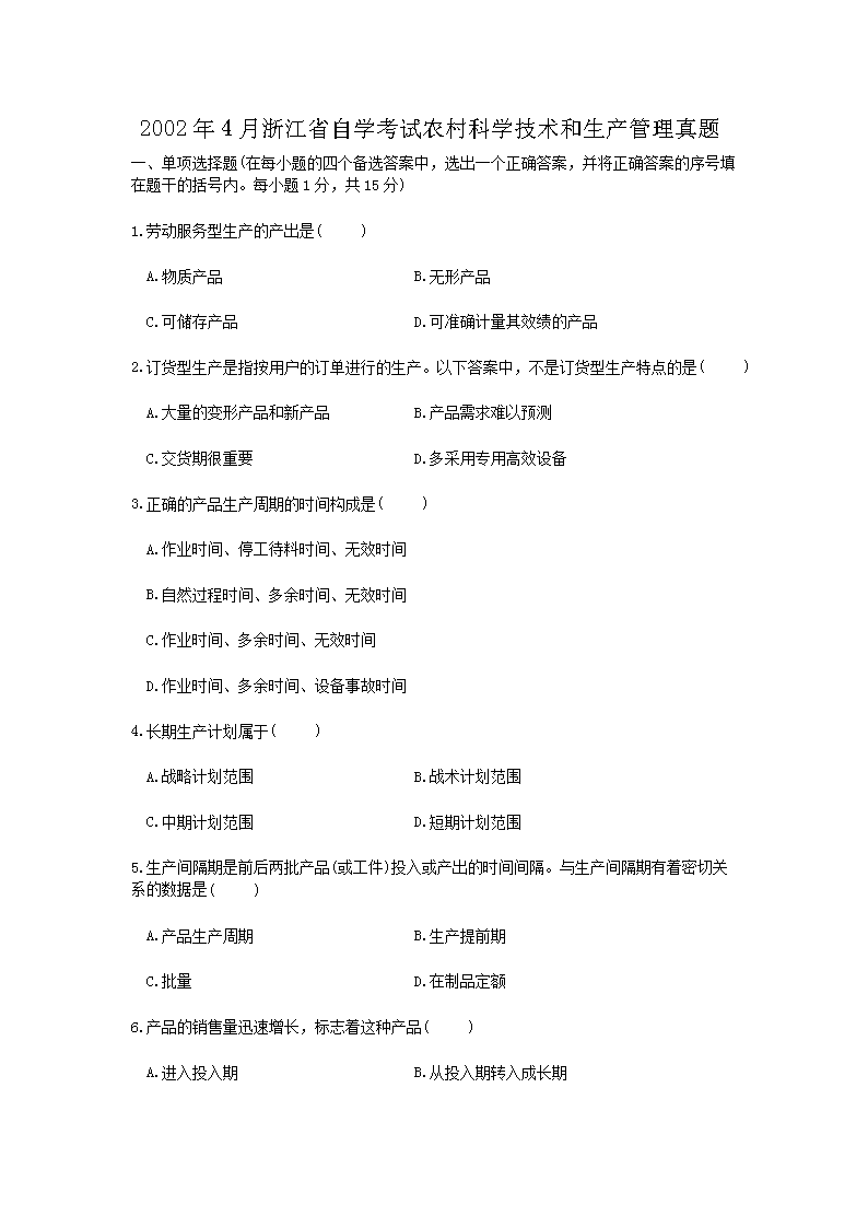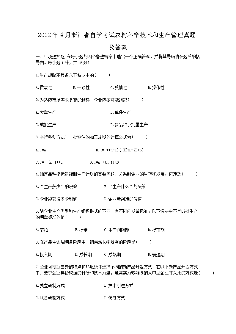 【文档名称】2002年4月浙江省自学考试农村科学技术和生产管理真题及答案(Word版)【文档格式】Word版【文档下载】VIP会员文档下载【文档介绍】{...