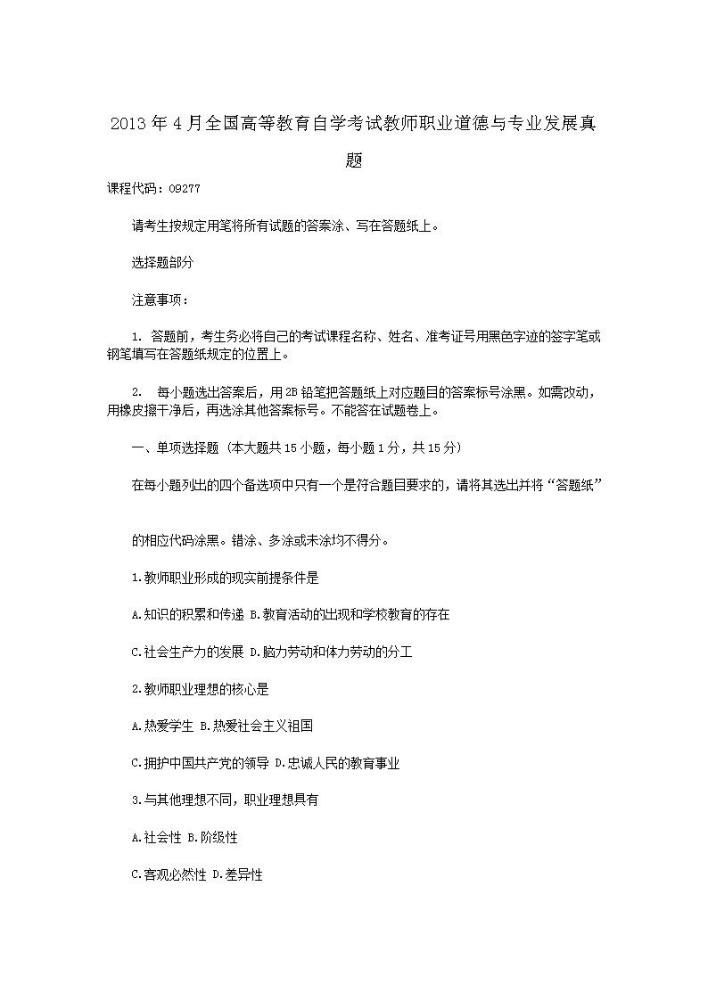 【文档名称】2013年4月全国高等教育自学考试教师职业道德与专业发展真题(Word版)【文档格式】Word版【文档下载】VIP会员文档下载【文档介绍】{...