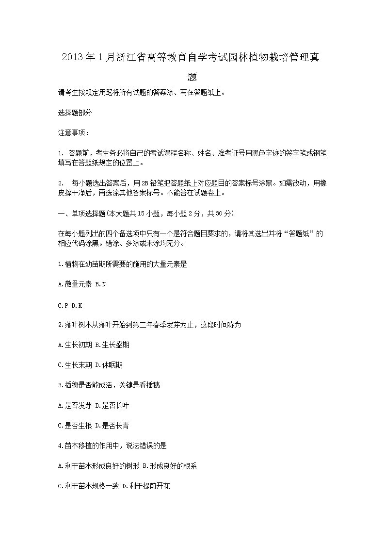 【文档名称】2013年1月浙江省高等教育自学考试园林植物栽培管理真题(Word版)【文档格式】Word版【文档下载】VIP会员文档下载【文档介绍】{{s...