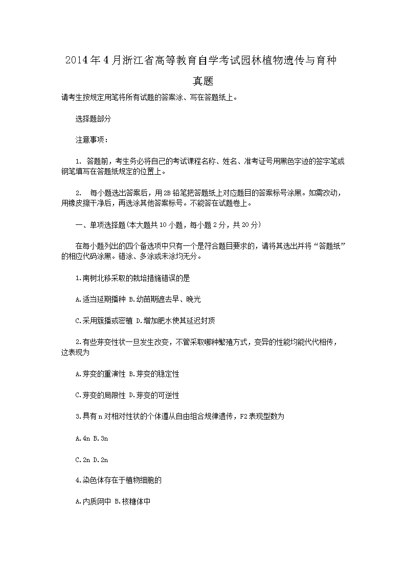 【文档名称】2014年4月浙江省高等教育自学考试园林植物遗传与育种真题(Word版)【文档格式】Word版【文档下载】VIP会员文档下载【文档介绍】{{...